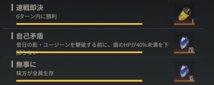 ユージーンを撃破する前に、盾のHPが40%未満を下まわらない | 純晶×20 |