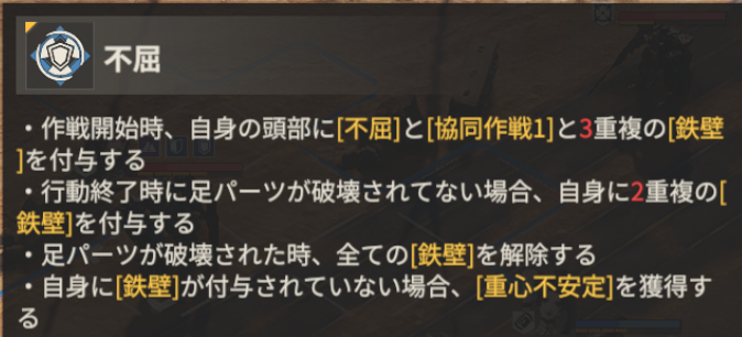 ![]() | ・頭部に不屈を付与 ・足パーツ破壊で大盾効果を無効 ・狂潮射撃の連続攻撃が脅威 |