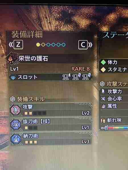 業物3、見切り1、弱点特攻1武器スロ1防具スロ11が出ました。大剣で使ってるが、太刀向けな気がしてきた。