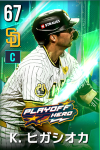 K.ヒガシオカ | パワー:72 ミート:64 選球:68 忍耐力:60 走塁:66 守備:75 ・パワーが高水準 ・ホットゾーンは9箇所 ・平均打球角度は17° |