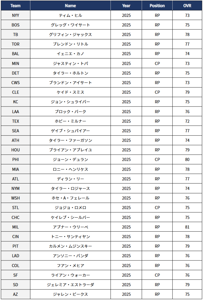 | RivalPick 選出基準 | 各球団で登板数が最も多い選手 |