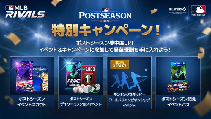 MLB RIVALS(ライバルズ)における2025年MLBポストシーズンイベントのまとめ記事です。各イベントの進め方や注目報酬について掲載。MLBライバルズポストシーズンイベントはこちらを参考にして下さい。