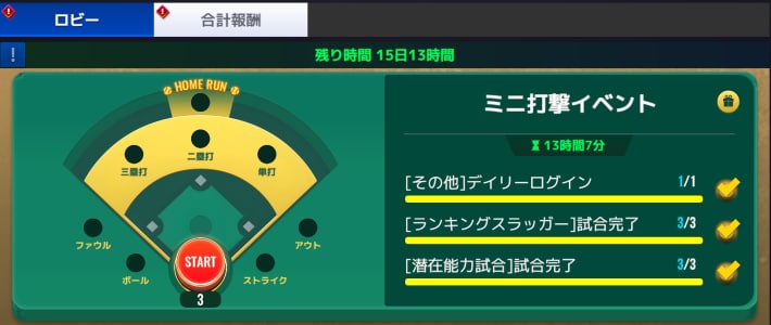 ランキングスラッガー/潜在能力試合を3試合消化することで打撃チャンスを獲得し、合計回数の到達報酬でスカウトチケット50枚を受け取れる。日々ミッションは更新されるので、毎日欠かさずにミッションをクリアしよう。