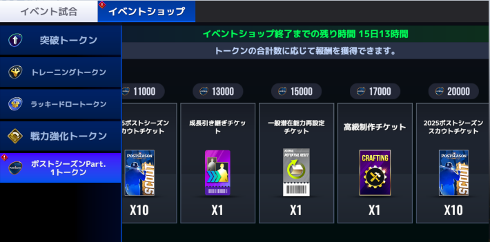ポストシーズンイベント試合で集めたトークンをイベントショップでスカウトチケット50枚と交換可能。スカウトチケット以外にも高級制作チケットや各種育成素材も入手できるので、ボールを優先的に消費しよう。