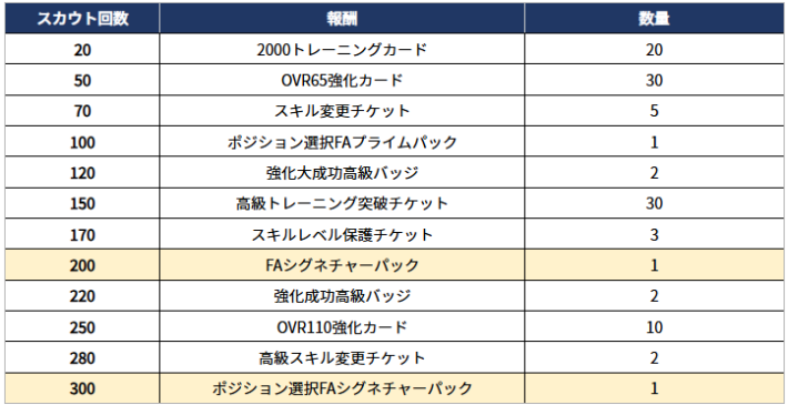 累計スカウト報酬として、100/200/300回で各種FA選手パックを獲得可能。300回以降もスカウトは継続可能だが、追加の累計報酬はない点に注意しよう。
