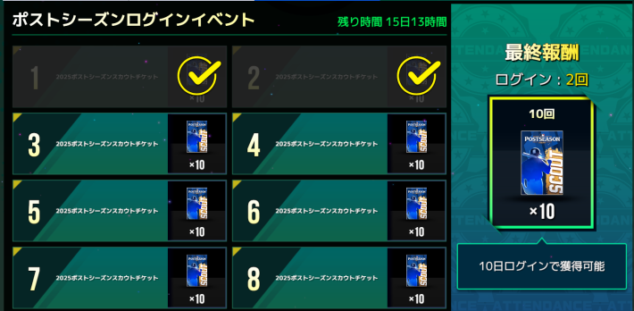 期間内のログインイベントでポストシーズンスカウトチケットが100枚配布される。欠かさずにログインして、毎日の受け取りを徹底しよう。
