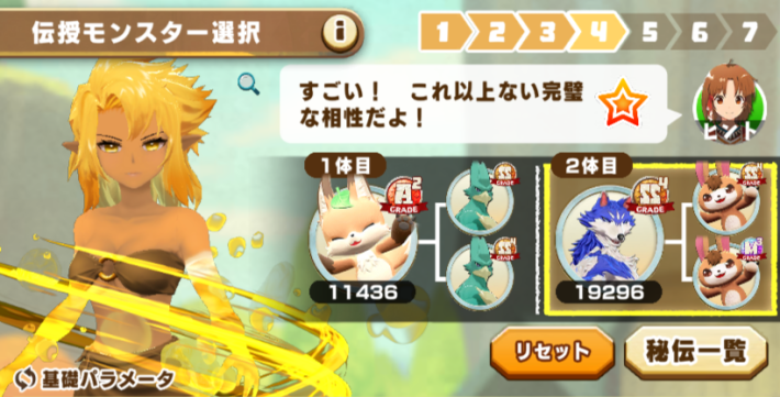 「四大大会制覇」や「シナリオ秘伝」等、強力な秘伝を持つマスモンをフレンドからレンタルして、全ステータスを大きくUPさせた状態から育成開始しよう。ステータス秘伝はそこまで重要ではないが、「相性」は重要なため、伝授画面で◎や★と表示されるモンスターから伝授したい。