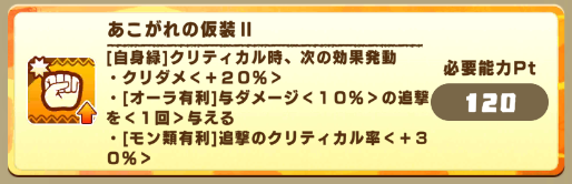 ![]() 必要Pt:120 | あこがれの仮装Ⅰ [自身緑]クリティカル時、クリダメ<+20%> |