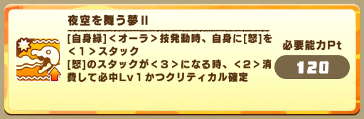 ![]() 必要Pt:120 | 夜空を舞う夢Ⅰ [自身緑]<オーラ>技発動時、自身に[怒]を<1>スタック [怒]のスタックが<3>になり、かつ技命中時、<2>消費してクリティカル確定 |
