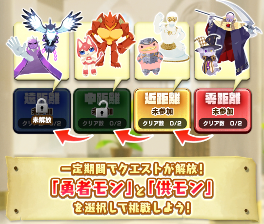 各距離×勇者モン×2の計8クエストのクリアや、ミッション達成を目指して挑戦を続けよう。最大ダメージを競うランキングシステムも存在するため、上位を狙う場合は強力な供モンの育成も重要となるぞ。