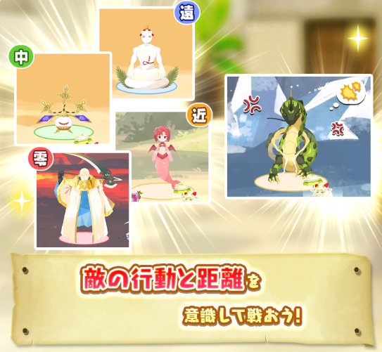 バトル中の敵の行動や、一部のカード効果により敵の「距離」が変化する。敵との位置関係によって与ダメージが変化し、同じ距離にいると一番与ダメージが高くなるため、なるべく近いモンスターに攻撃させることが重要だ。