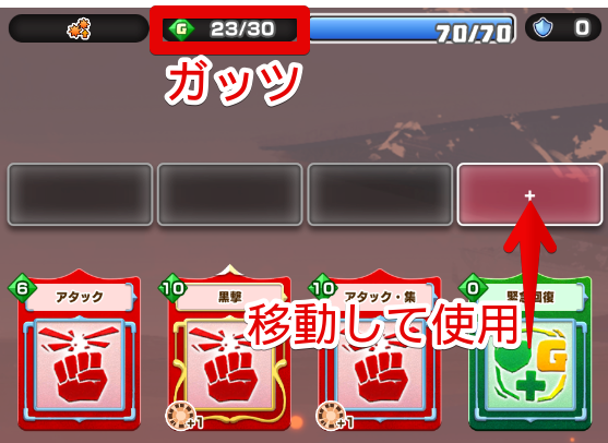 ガッツを消費し、画面上の「+」エリアにカードを移動させることで、手札からカードを消費して使用できる。ガッツが足りない場合は使用できないため、常にガッツ量を意識しておくことが重要だ。
