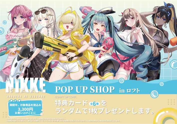 ロフト6店舗でPOP UP SHOPが開催。新規書き下ろしの夏コスチュームのキャラたちのグッズを購入でき、3,300円購入ごとに特典カードをランダムで1枚貰える。