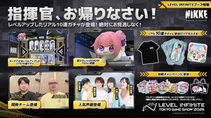 NIKKEが東京ゲームショウ(TGS)2025にて「Level Infiniteブース」での出展が決定。オフラインイベントお馴染みのリアル10連ガチャや声優陣による名シーン再現 、プロデューサーインタビューなどを実施予定。物販では描き起こしイラストのグッズも販売される。