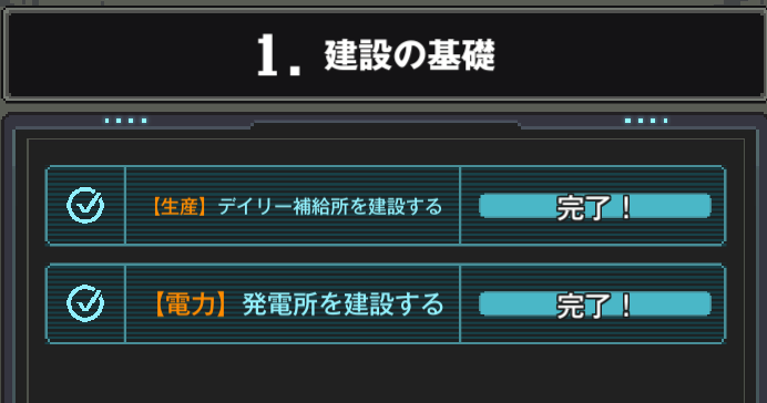 資源は「資源収集所」や「エネルギー転換所」などの施設で生産できる。施設の稼働には電力が必要になり、電力不足だと生産速度が遅くなるので必ず発電所を建設しよう。