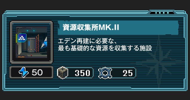 施設はエデン内の空いているマスに建設できる。施設によって建設に必要な資源量が異なるので、資源が足りない場合は派遣などで集めよう。