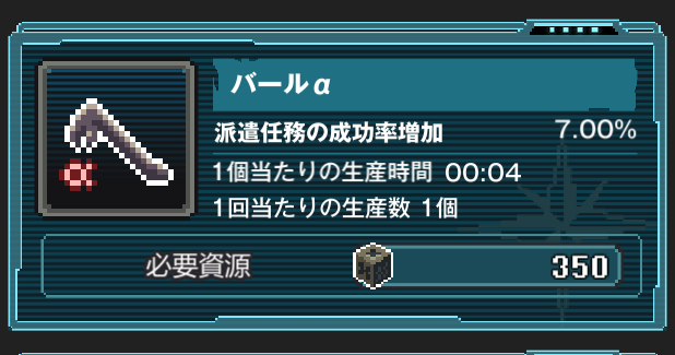 装備生産施設で作った装備は部隊に装着できる。装備によって任務の成功確率増加や報酬の資源増加の効果を得られるので、資源に余裕ができたら装備を作って部隊につけよう。ただし、装備は任務1回に1個消費する消耗品なので気を付けよう。