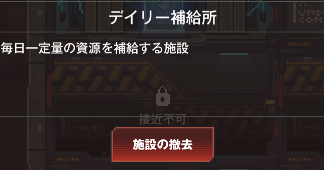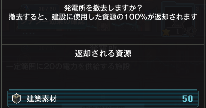 施設を撤去した場合、建設に使った資源は100%変換される。施設の位置を変えたり、上位施設に置き換えたいときに活用しよう。ただし、施設の強化に使った素材は帰ってこないので注意。