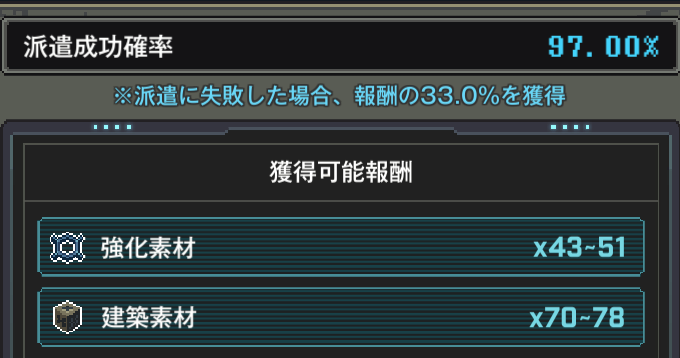 各任務には成功確率が設定されており、成功すると資源を多くもらえる。失敗した場合も資源を入手できるが、報酬量が減るので任務を選ぶ際には成功確率も確認しよう。