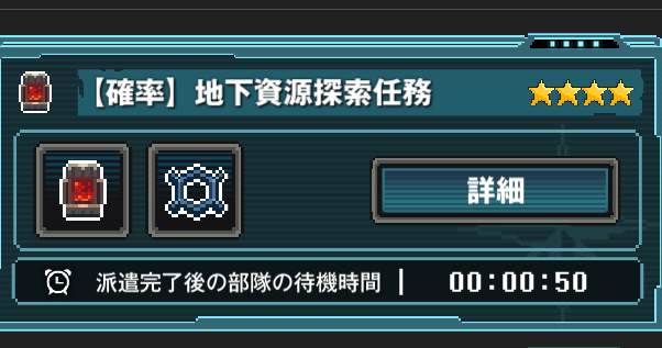 部隊を編成したら、派遣する任務を選ぼう。任務によって資源の種類や入手量が変わるため、自分の欲しい資源が貰える任務を選ぼう。