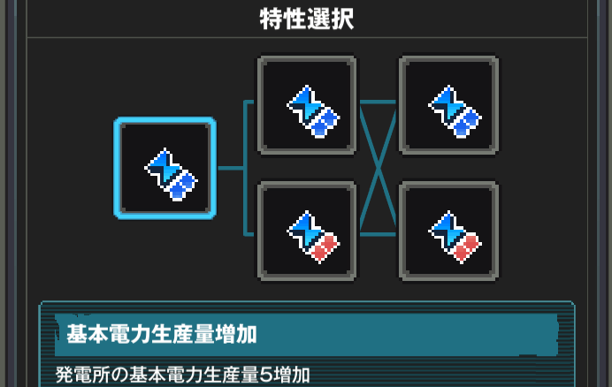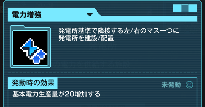 | 発電所 | 発電所同士が隣接すると生産電力20増加 |