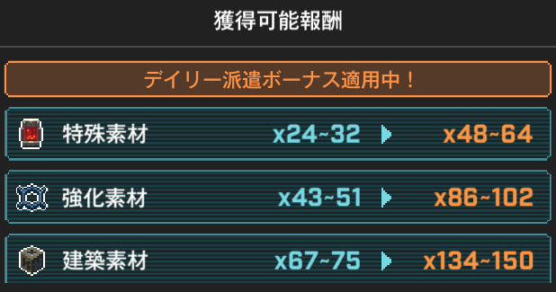 派遣任務は1日に3回までボーナスが適用される。ボーナスが適用された任務は報酬量が2倍になるため、報酬がたくさんもらえる任務で活用しよう。