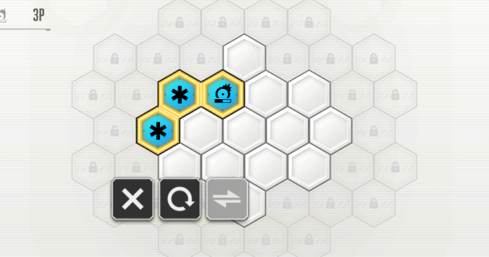 コード研究所を開いたら属性を選んでボードにブロックを配置しよう。ブロックは属性ごとにボードが用意されており、同じ属性のブロックのみ装着できる。ブロックは回転できるので、ボードが埋まるように装着するブロックを選ぼう。