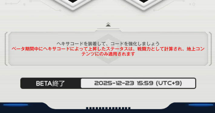 地上コンテンツのベータ版では、ヘキサコードの効果は地上でのキャラ戦闘力のみに影響する。正式版ではレイドや迎撃戦などのコンテンツにも効果を発揮するため、実装後は地上攻略を進めてキャラを強化しよう。