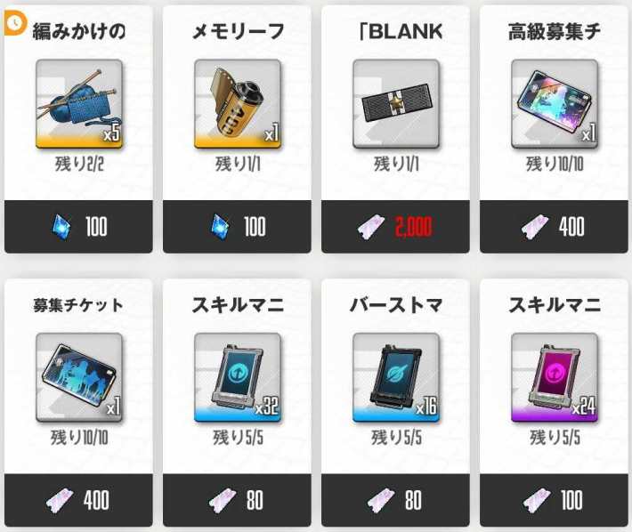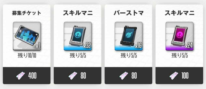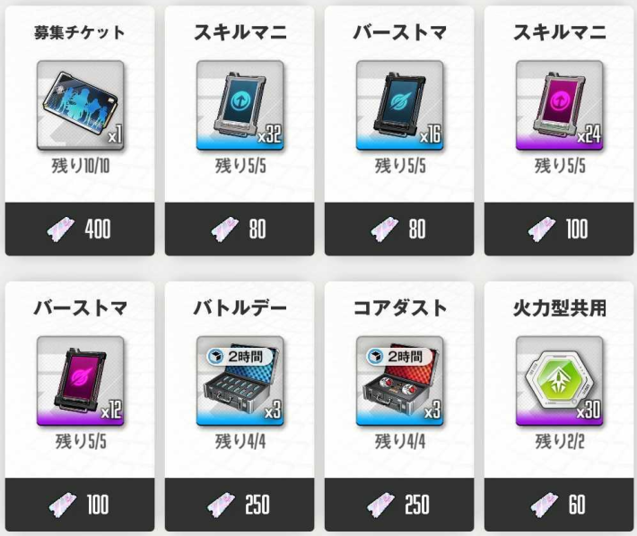 募集チケットやコンソールを交換した上でさらに余裕があれば、不足している育成素材も交換しておこう。特にコアダストは後半ボトルネックになりがちな素材なので、序盤から少しでも集めておきたい。