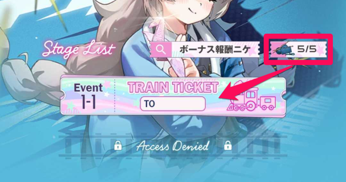 ボーナス適用ニケをパーティに編成すると、ステージクリア時に確率で行き先未定のチケットが手に入るようになる。ボーナスキャラを複数編成すれば行き先未定のチケットのドロップ率を高められるので、対象キャラを持っていたらなるべく編成したい。