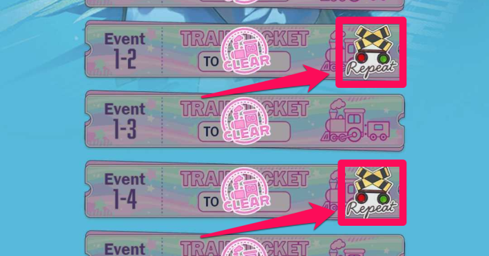「リピート」と表記のあるステージは、一度クリアした後も何度でも挑戦できる。ステージによって獲得可能な育成素材が決まっているので、勝てなくなった場合は欲しいアイテムが手に入るステージを周回しよう。
