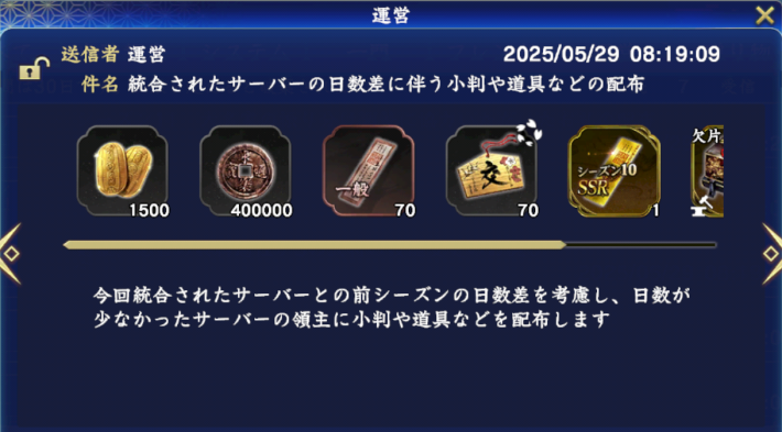 サーバー統合では、先行しているサーバーに後発のサーバーが統合される場合がある。その場合は後発側サーバーの領主に、前シーズンの日数差に応じたアイテム配布があるため活用しよう。