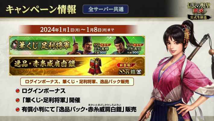 新登場武将となる足利義輝、足利義昭が登場する「筆くじ・足利将軍」が開催される。同時に逸品・赤糸威肩白鎧パックなども販売されるため、併せてチェックしよう。
