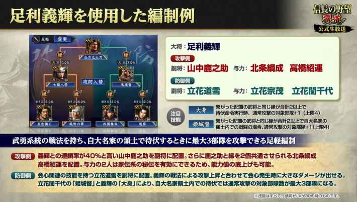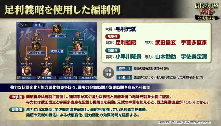 毛利元就と足利義昭を並べた強力な妨害戦法を持つ弓部隊編制。機略/封殺の技能を重ねることにより、素早く持続の長い弱体化を発動できる。