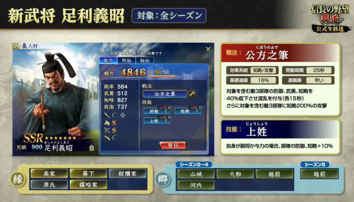 騎馬S/弓Sの適正を持ち、敵部隊に多種多様な弱体化を付与できる武将。与力や副将で輝く技能「上姓」で防御と知略を上昇させることも可能だ。