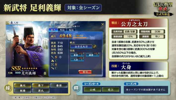 待伏時に攻撃対象を増加させることが出来る足軽S、弓Sの適正を持つ武将。兵力が下がるほど威力の上がる武勇系戦法で、粘り強く高ダメージを与えることが出来る。