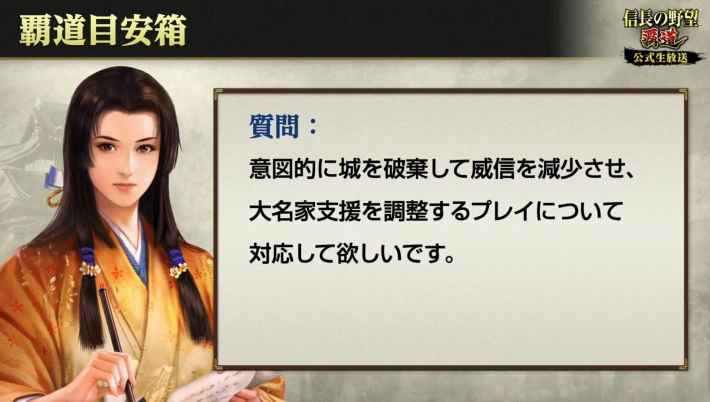 大名家として優勢にある場合、わざと城を手放すなどして大名家同士の威信差を減らし、大名家支援を減らすプレイングが行われている。運営としてはより活発な戦況にすべく調整していきたいが、抜け道のない対策には時間が掛かるとのことだ。