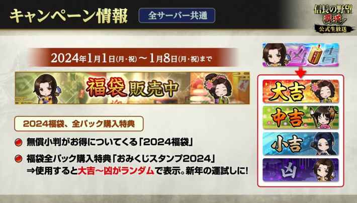 無償小判がお得に入手できる福袋パックも販売される。チャットで使用するたびに結果の変わるおみくじスタンプも登場するとのことだ。