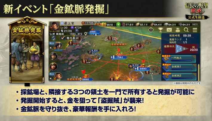 賊の討伐によりクリアとなるが、金鉱脈の体力を保つことで報酬も増加するため、待伏と遊撃のバランスが重要だ。技能による攻撃対象数増加などをうまく使うことで有利に攻略を進められる。