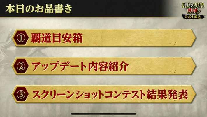 12月26日放送の信長の野望 覇道(信長覇道)の公式生放送についてまとめています。各種キャンペーンの開催情報や新武将について、その他アップデート予定などを掲載。信長の野望 覇道生放送について知りたい際にご活用ください。