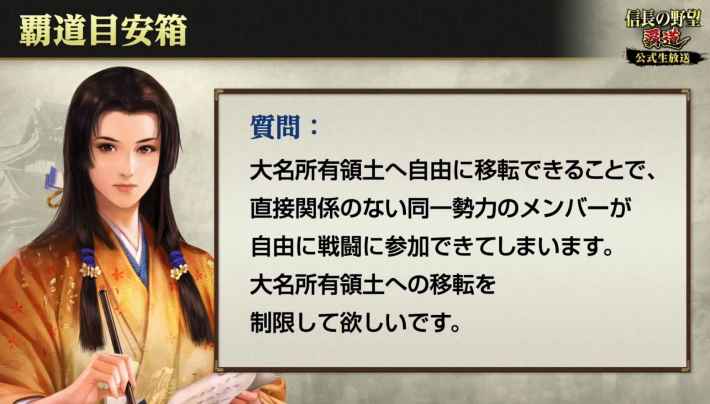 同じ大名家同士、協力し合うことが信長の野望覇道の魅力となるため、制限の予定は無いとのこと。領土戦時は他一門との声掛けをしながら臨んでほしいとのことだ。