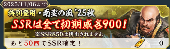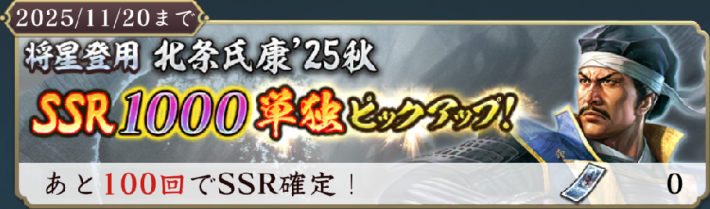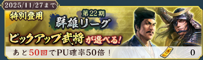 同時開催の登用では、群雄リーグで威名ボーナスを持つ武将がピックアップ。群雄リーグでは、北条家と伊達家の威名900以上の武将は威名が200%上昇、威名850以下の武将は150%上昇するため、北条/伊達家の武将を多く編成することで戦力の高い部隊を編成できる。