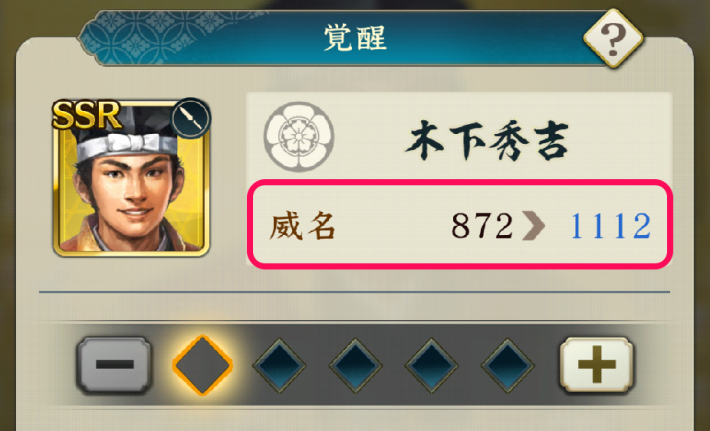 武将が覚醒すると「威名」が大幅に上がる。覚醒は「強化」で武将レベルを10上げるのと同等の数値威名が上がるので、覚醒ができる武将は積極的に覚醒させよう。