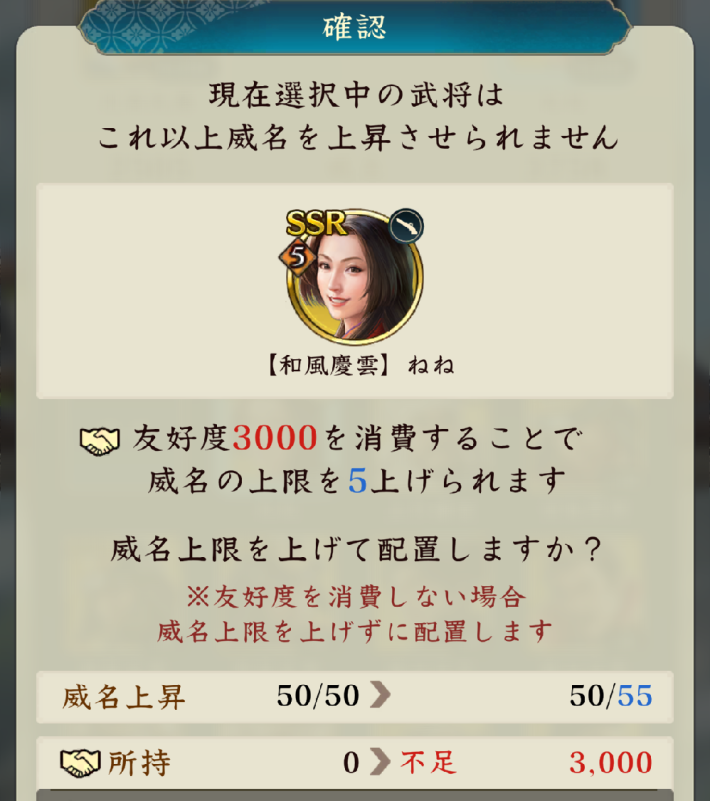 武家屋敷では、武将の友好度を使うことで威名上限を上げられる。能力の高い武将やレアリティは低いが強力な特性を持つ武将は、合戦や内政で使える可能性があるため友好度を残しておこう。