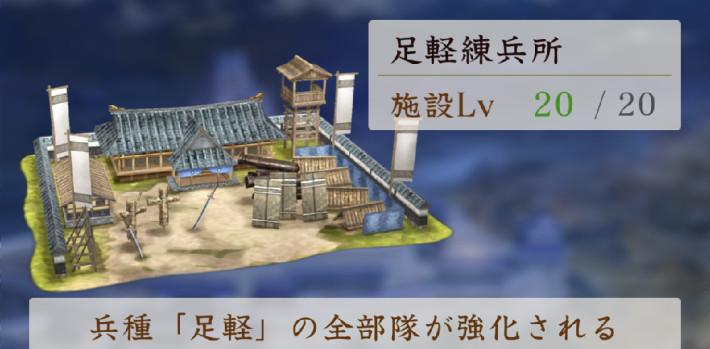 内政の「足軽練兵所」など各練兵所を強化することで、対応した兵種の部隊能力を全て強化できる。武勇や威名が高い武将を内政武将に任命することで施設効果を上げられるため、武勇を上げる装備品を装備した武将を任命しよう。