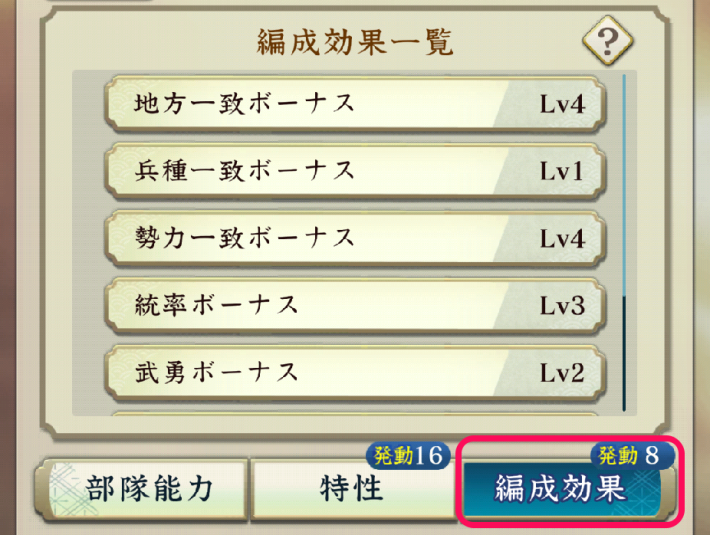 兵種一致ボーナス | 大将と同じ兵種の武将を1~4人編成する 部隊の兵数4%~16%上昇 関係者の連係率5%~20%上昇 |