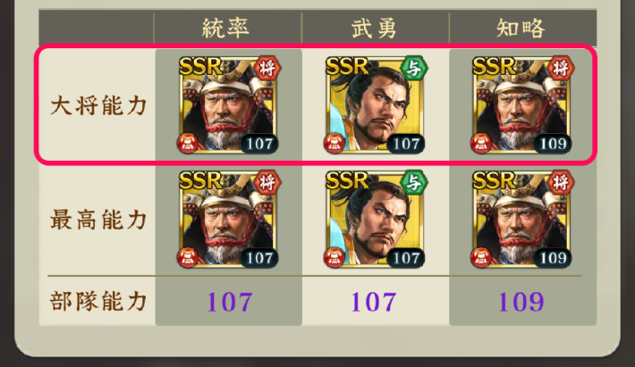 名将ボーナス:統・武・知 | 部隊の統率・武勇・知略が全て100~105以上にする 部隊の兵数5%~50%上昇 |