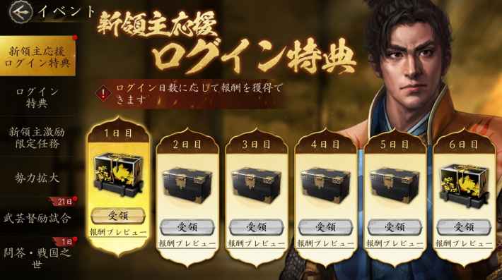 『新領主応援ログイン特典』をはじめとした報酬も、ログイン日数に応じて段階的に配布されます。こうした点からも、継続的にログインしてプレイ日数を重ねることが重要であると言えます。