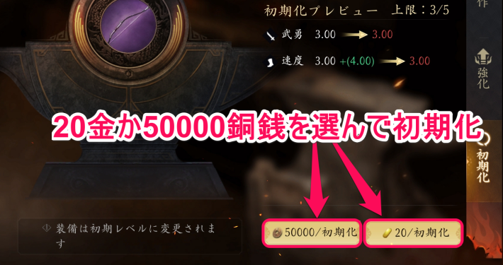 装備の強化は初期化が可能で、20金もしくは50000銅銭を支払うと未強化の状態に戻ります。目的の能力を伸ばしたい場合は、強化を何度もやり直すことが可能です。