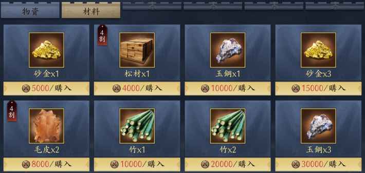 天下布武第10章以降では、材料市場に砂金が並ぶようになります。材料の方が優先度は高いですが、装備の強化を進めたい場合はおすすめです。